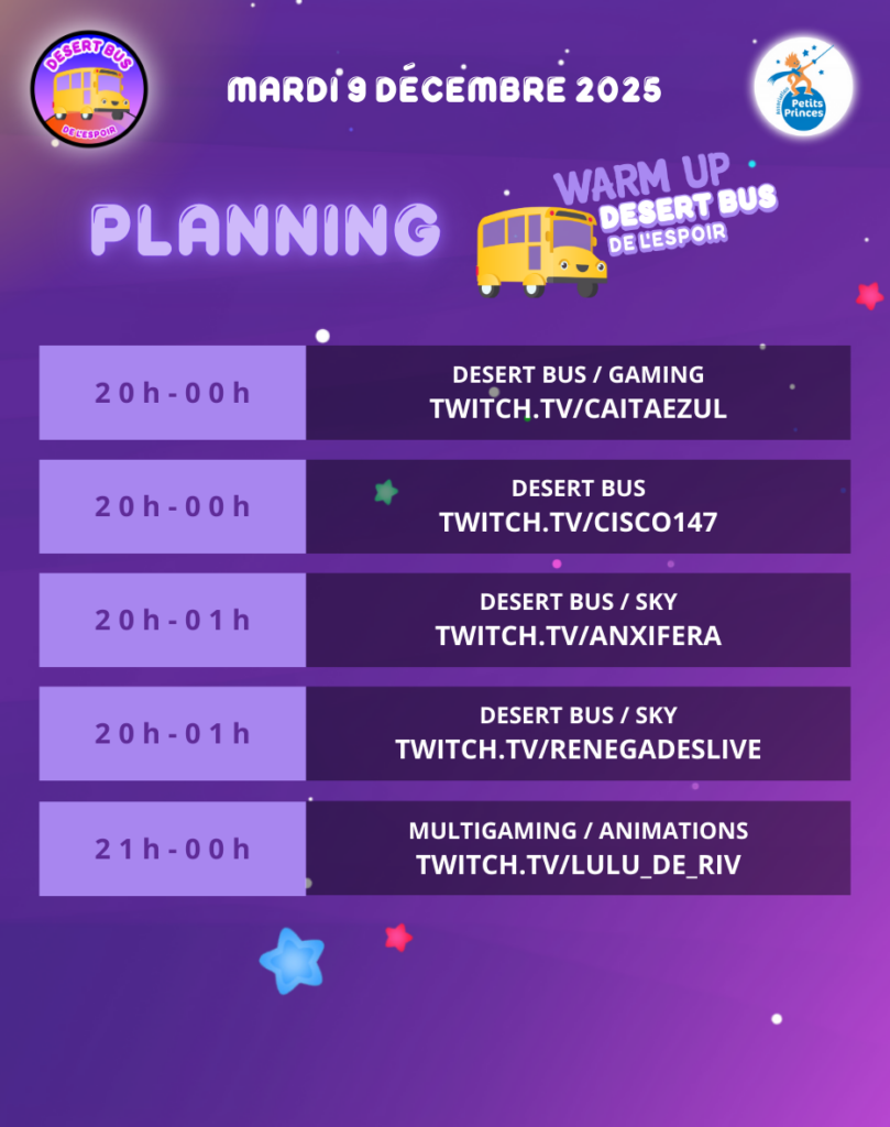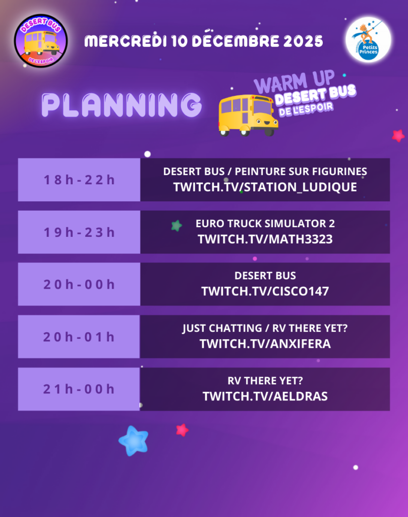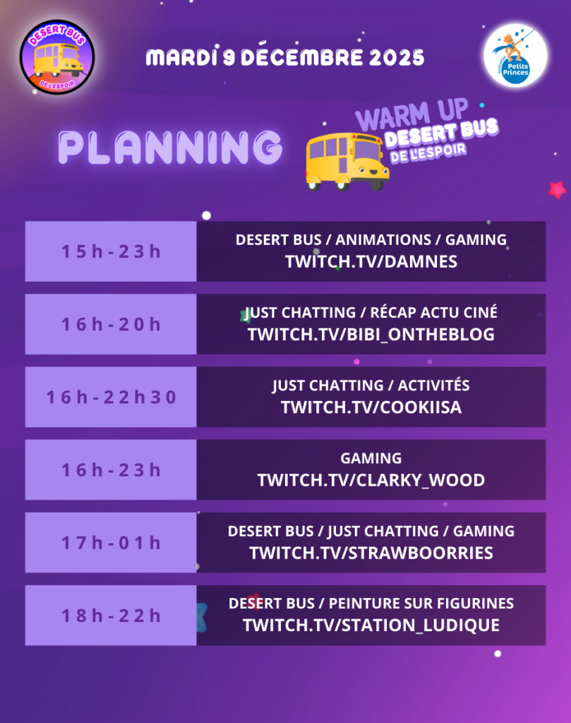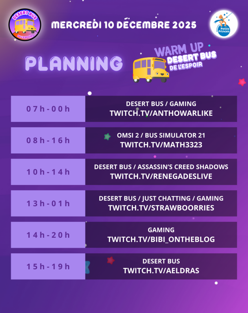 Durant 3 jours sur Twitch, 21 streameureuses vont prendre la route et conduire le bus du Desert Bus pour récolter des dons pour l’Association Petits Princes. Au programme : des jeux vidéos, de l’amusement, et bien plus encore !